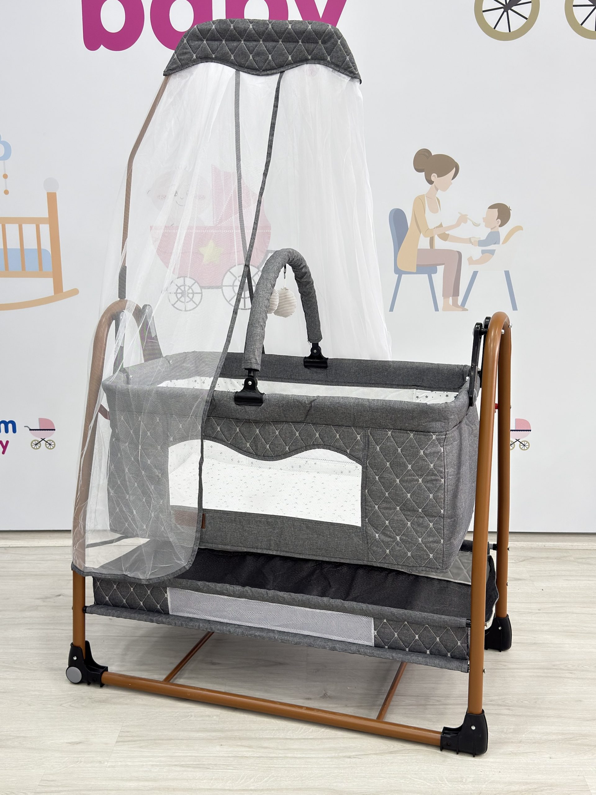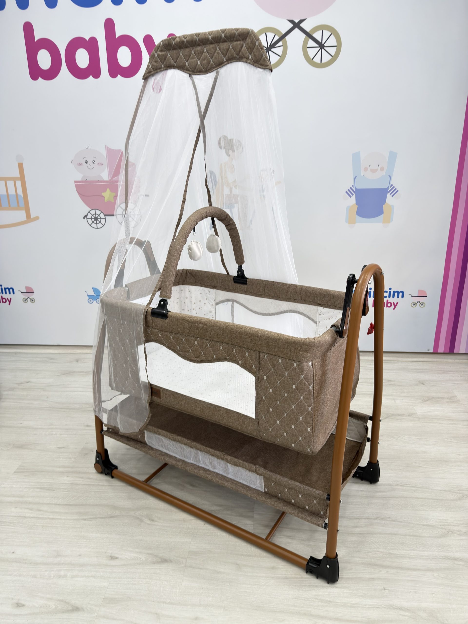 Üzerinde bulunan oyuncak barı bebeğinizin dikkatini çeker ve keyifli vakit geçirmesini destekler. Cibinlik detayı ise bebeğinizi sinek ve dış etkenlere karşı koruyarak daha huzurlu bir uyku ortamı sağlar. Dayanıklı ve kullanışlı yapısı sayesinde 2–3 yaşa kadar güvenle kullanılabilir.